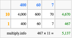 Finally, we add up all the sums we found in step 3 to get our final answer to 467 times 11.