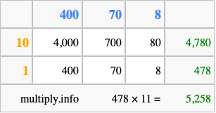 Below is an illustration showing you how to calculate 478 times 11 using the box method, using the instructions above.