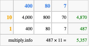 Finally, we add up all the sums we found in step 3 to get our final answer to 487 times 11.
