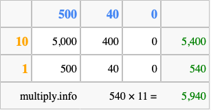 That's all there is to it! As you can see from the box above, the answer to 540 times 11 using the box method is 5,940.
