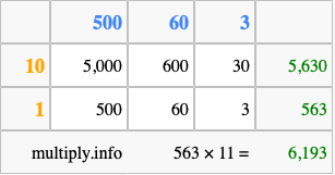 Below is an illustration showing you how to calculate 563 times 11 using the box method, using the instructions above.