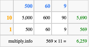 Below is an illustration showing you how to calculate 569 times 11 using the box method, using the instructions above.