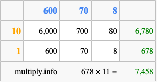 Below is an illustration showing you how to calculate 678 times 11 using the box method, using the instructions above.