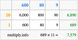 That's all there is to it! As you can see from the box above, the answer to 689 times 11 using the box method is 7,579.