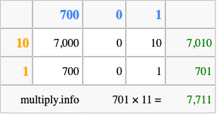 Below is an illustration showing you how to calculate 701 times 11 using the box method, using the instructions above.