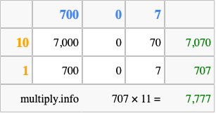 That's all there is to it! As you can see from the box above, the answer to 707 times 11 using the box method is 7,777.