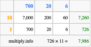 That's all there is to it! As you can see from the box above, the answer to 726 times 11 using the box method is 7,986.