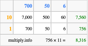 Below is an illustration showing you how to calculate 756 times 11 using the box method, using the instructions above.