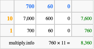Below is an illustration showing you how to calculate 760 times 11 using the box method, using the instructions above.
