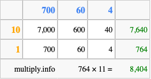 Below is an illustration showing you how to calculate 764 times 11 using the box method, using the instructions above.