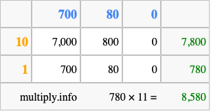 Below is an illustration showing you how to calculate 780 times 11 using the box method, using the instructions above.