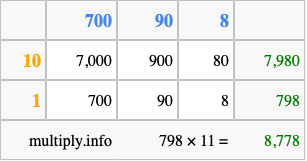Below is an illustration showing you how to calculate 798 times 11 using the box method, using the instructions above.