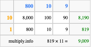 Below is an illustration showing you how to calculate 819 times 11 using the box method, using the instructions above.