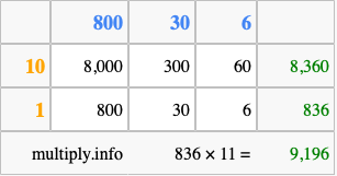 Below is an illustration showing you how to calculate 836 times 11 using the box method, using the instructions above.