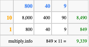Below is an illustration showing you how to calculate 849 times 11 using the box method, using the instructions above.