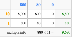 Below is an illustration showing you how to calculate 880 times 11 using the box method, using the instructions above.