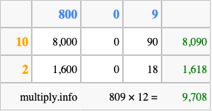Below is an illustration showing you how to calculate 809 times 12 using the box method, using the instructions above.