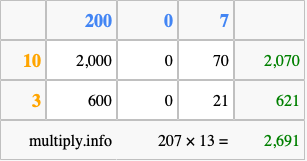 That's all there is to it! As you can see from the box above, the answer to 207 times 13 using the box method is 2,691.