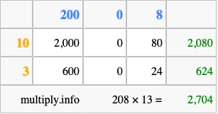 That's all there is to it! As you can see from the box above, the answer to 208 times 13 using the box method is 2,704.