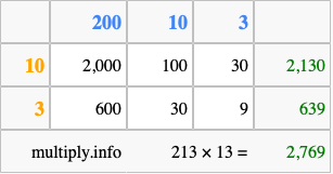 That's all there is to it! As you can see from the box above, the answer to 213 times 13 using the box method is 2,769.