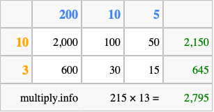That's all there is to it! As you can see from the box above, the answer to 215 times 13 using the box method is 2,795.