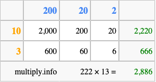 Below is an illustration showing you how to calculate 222 times 13 using the box method, using the instructions above.