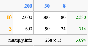 That's all there is to it! As you can see from the box above, the answer to 238 times 13 using the box method is 3,094.