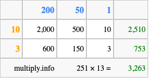 That's all there is to it! As you can see from the box above, the answer to 251 times 13 using the box method is 3,263.