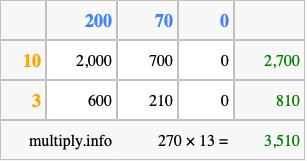 Below is an illustration showing you how to calculate 270 times 13 using the box method, using the instructions above.