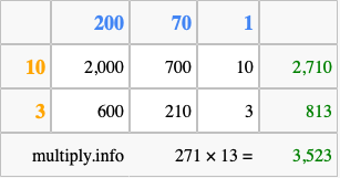 That's all there is to it! As you can see from the box above, the answer to 271 times 13 using the box method is 3,523.