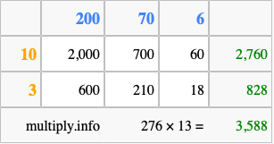 That's all there is to it! As you can see from the box above, the answer to 276 times 13 using the box method is 3,588.