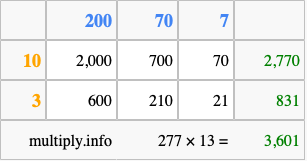 Below is an illustration showing you how to calculate 277 times 13 using the box method, using the instructions above.