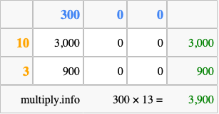 Below is an illustration showing you how to calculate 300 times 13 using the box method, using the instructions above.