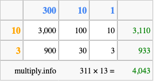 That's all there is to it! As you can see from the box above, the answer to 311 times 13 using the box method is 4,043.