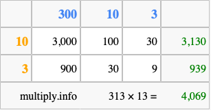 Below is an illustration showing you how to calculate 313 times 13 using the box method, using the instructions above.