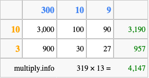 Below is an illustration showing you how to calculate 319 times 13 using the box method, using the instructions above.
