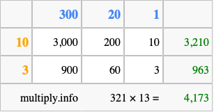 Finally, we add up all the sums we found in step 3 to get our final answer to 321 times 13.