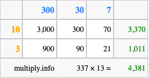 Below is an illustration showing you how to calculate 337 times 13 using the box method, using the instructions above.