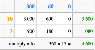 That's all there is to it! As you can see from the box above, the answer to 360 times 13 using the box method is 4,680.
