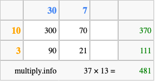 That's all there is to it! As you can see from the box above, the answer to 37 times 13 using the box method is 481.