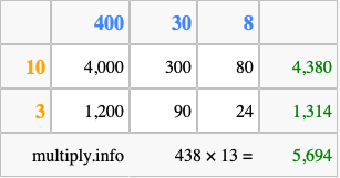 That's all there is to it! As you can see from the box above, the answer to 438 times 13 using the box method is 5,694.