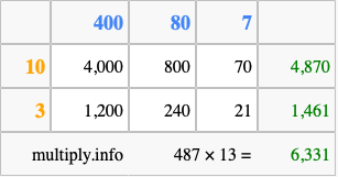 Finally, we add up all the sums we found in step 3 to get our final answer to 487 times 13.