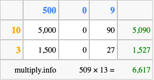 Below is an illustration showing you how to calculate 509 times 13 using the box method, using the instructions above.