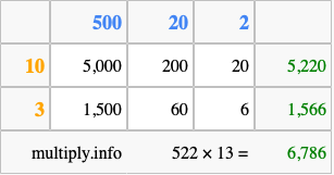That's all there is to it! As you can see from the box above, the answer to 522 times 13 using the box method is 6,786.