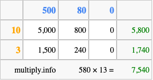 Below is an illustration showing you how to calculate 580 times 13 using the box method, using the instructions above.