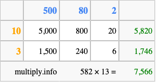 Below is an illustration showing you how to calculate 582 times 13 using the box method, using the instructions above.