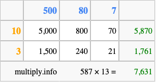 Below is an illustration showing you how to calculate 587 times 13 using the box method, using the instructions above.