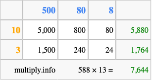 That's all there is to it! As you can see from the box above, the answer to 588 times 13 using the box method is 7,644.
