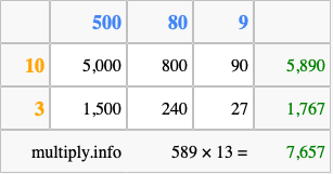 That's all there is to it! As you can see from the box above, the answer to 589 times 13 using the box method is 7,657.