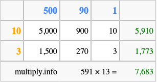 Below is an illustration showing you how to calculate 591 times 13 using the box method, using the instructions above.